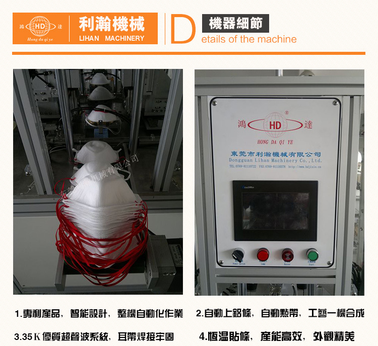 該機是利瀚公司精心研發出來針對杯型口罩上帶而規劃,其設備自動化程度較高, 將傳統比較冗雜的口罩出產工藝進行技能革新,到達從口罩鼻梁條焊接、耳帶焊接一次完結,然后大大的提高質量與產能。 1.選用德國原機技能,使用超聲波與自動化操控,將口罩鼻梁條貼合與耳帶焊接一次性完結。