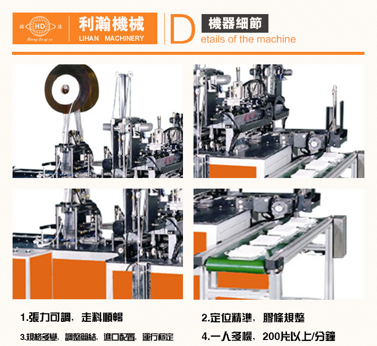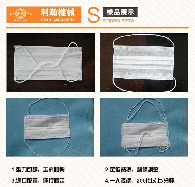 “鴻達牌”全自動頭掛式耳帶焊接機,將PU質料耳帶使用超聲波把兩邊進行焊接,設備具有焊接結實、功率高級長處,耳帶焊接均為自動化完結,是一款節約人工,比較先進的口罩設備。