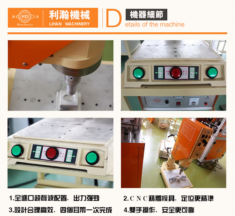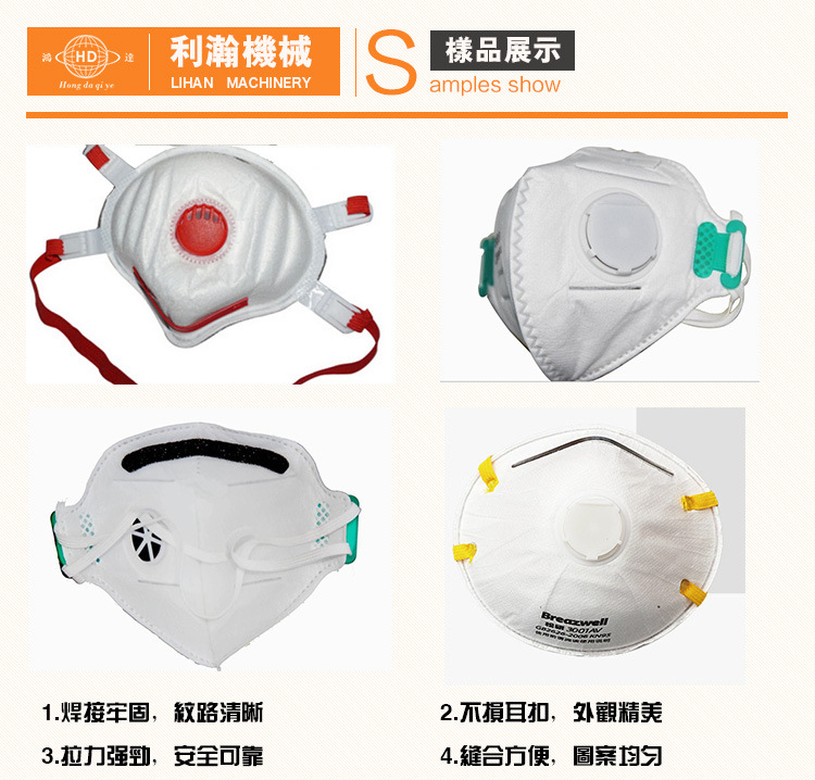 “鴻達”牌呼吸閥耳帶焊接機,是利瀚企業熟練掌握口罩生產工藝后, 依據N95口罩特色,推行出新的一款專用設備,運用超聲波體系到達呼閥焊接完美結合,替換模具也可做耳帶焊接。