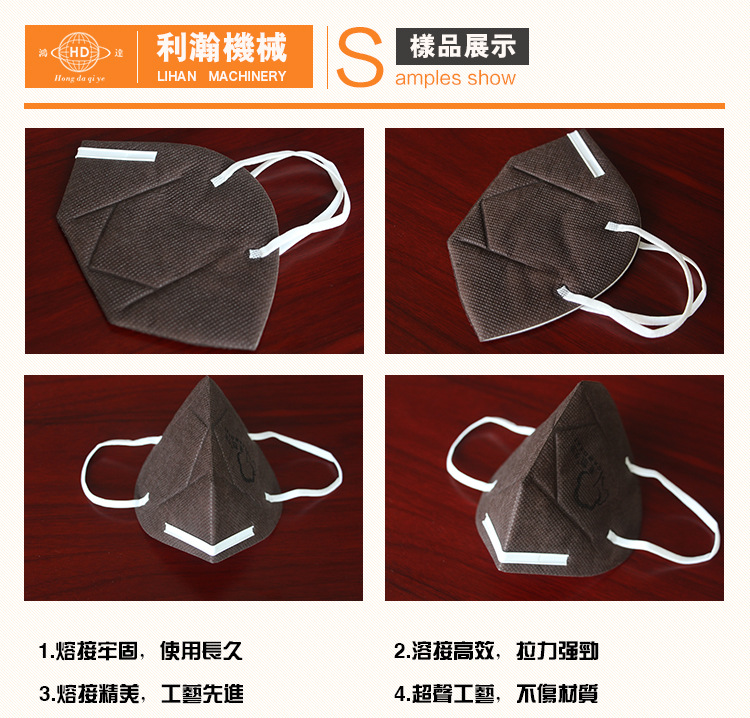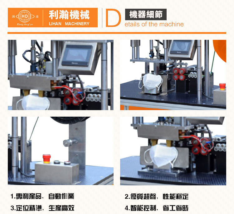 “鴻達”牌口罩外置鼻線熔接機是利瀚專為口罩貼鋁條而規劃的新產品, 該設備是使用程序控制完結主動化出產,從鼻線進入、主動剪切、恒溫熱壓貼 條均為主動化作業。制品外觀精巧,貼條結實,產能高效。