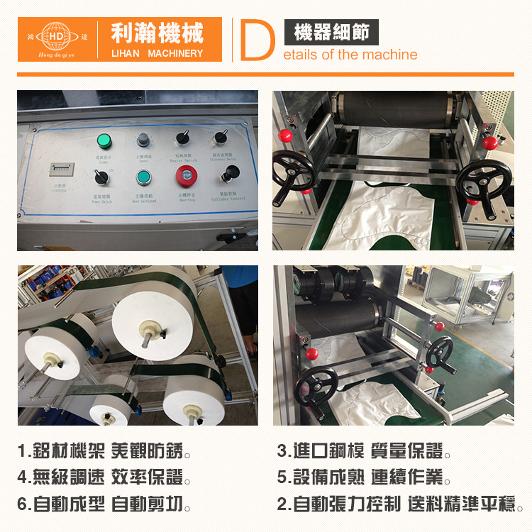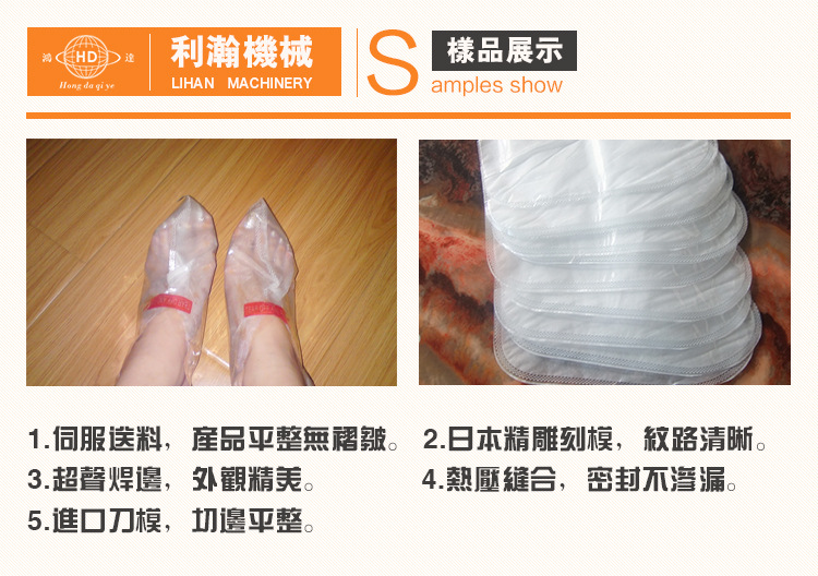 為出產(chǎn)不織布或塑膠鞋套之專用機(jī)。從送料至制品計(jì)數(shù)搜集全為主動(dòng)化操控,產(chǎn)能可達(dá)25-40雙/min。主動(dòng)張力操控。主動(dòng)循邊操控。可調(diào)式超音波熔接。全機(jī)採用鋁合金結(jié)構(gòu)