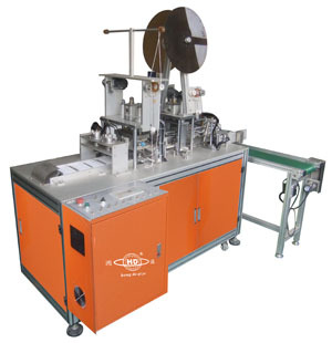 外耳帶焊接機(HD-LHKZJ11):外耳帶口罩機將松緊帶以超音波方法熔合于口罩本體兩外側,進而完結耳帶式口罩制品,僅需 一名操作員將口罩本體一片片置于運送帶治具上,其他后續動作至制品完結皆由機臺主動操作,本機產值較一般耳帶機高。