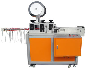 耳帶綁帶機(HD-LHKZJ12):超聲波口罩綁帶機選用超聲波焊接方法,于機臺上設置運送設備,于運送設備輸入口罩半制品,通過拉筒包邊, 再以超聲波花輪壓合后,將綁帶堵截,然后輸出制品,只需一人將口罩本體置於機器的傳輸帶上,其他后續作業均全主動完結。