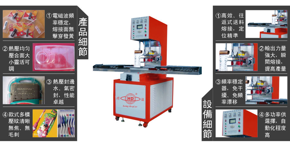 “鴻達”牌5-15KW單頭推盤式高周波熔接機是我司為提高環保理念而設計出的新產品,高周波(高頻機)塑膠熔接機(又名高周波塑膠熔接機),它是利用高頻電場使塑料內部份子振蕩產生熱能而進行各類制品熔合是塑料熱合的設備,周率穩定。本機振蕩周率采用國際工業波段13.56MHZ或27.12MHz,輸出周率穩定,符合國際標準,適合各地使用。高頻熱合機在工作或靜止時,無論是突然遇到停電還是停氣時,或者是通電還是通氣時,機器都是靜止狀態,保持原來位置,不會突然上升或下降;大大提高工人操作安全問題。低損耗同軸振蕩器,同調調諧器,高頻熱合機輸出力強縮短熔接時間,提高產量。