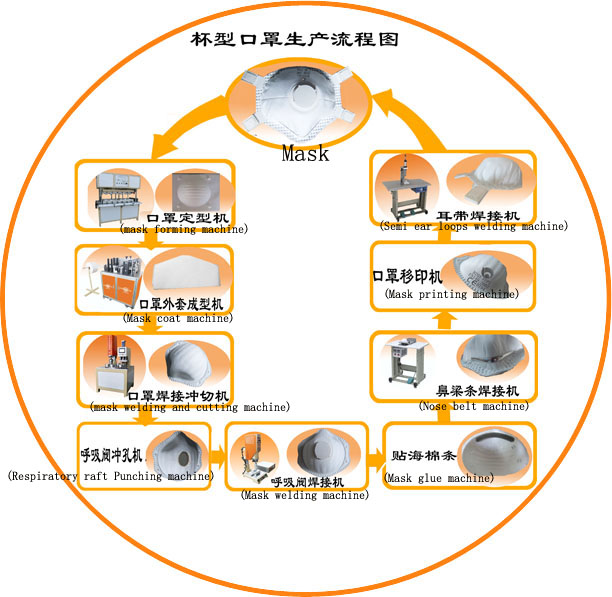 杯型口罩(Cup mask)是為了人們的健康而設計的,為了阻止一些對人*體*有害的可見或不可見的物質進行過濾,從而不會給人體帶來不*要的影響。**,常規杯型口罩都有如下生產流程。