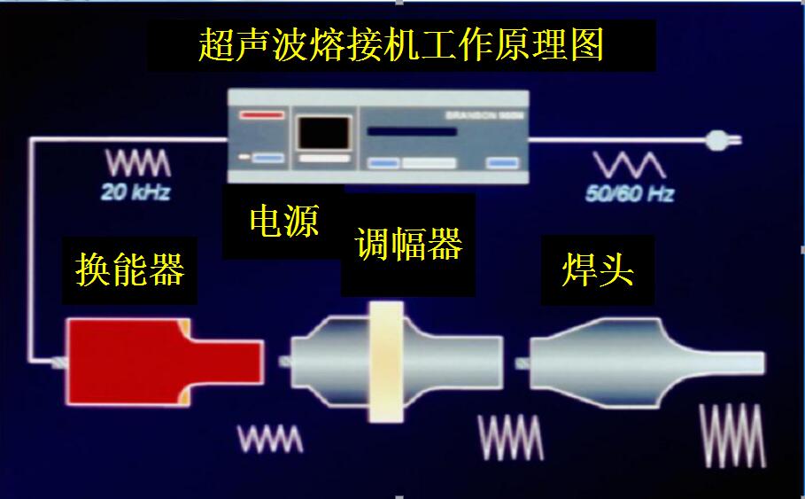 超聲波熔接裝置是通過一個電晶體功能設備將當前50/60Hz的電頻轉變成20KHz或40KHz的電能高頻電能,供應給轉換器。轉換器將電能轉換成用于超聲波的機械振動能,調壓裝置負責傳輸轉變后的機械能至超聲波熔接機的焊頭。焊頭是將機械振動能直接傳輸至需壓合產品的一種聲學裝置!! 振動通過焊接工作件傳給粘合面振動磨擦產生熱能使塑膠熔化, 振動會在熔融狀態物質到達其介面時停止,短暫保持壓力可以使熔化物在粘合面固化時產生個強分子鍵, 整個周期通常是不到一秒種便完成,但是其焊接強度卻接近是一塊連著的材料。 如下圖所示,振動能量從焊頭傳遞到工件,工件之間的摩擦產生的熱量將工件熔接面熔化,從而焊接成一體。