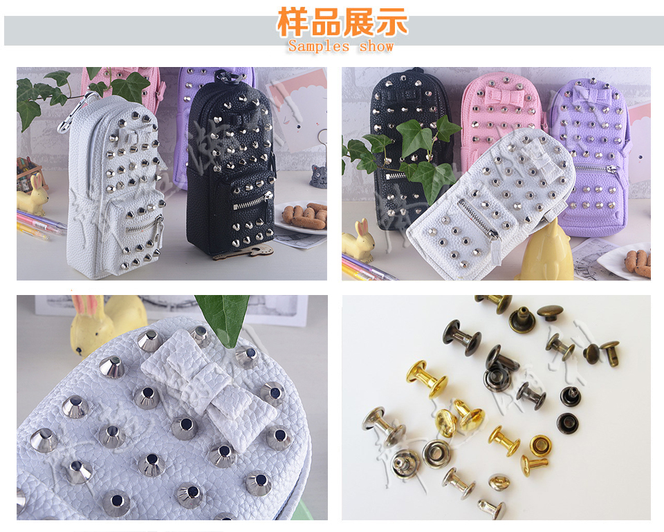 適用行業 適用于空心釘、中空釘之鉚合。屬鋁箱、化妝箱、珠寶盒等機器; 皮帶接頭、皮包扣帶等均可使用.